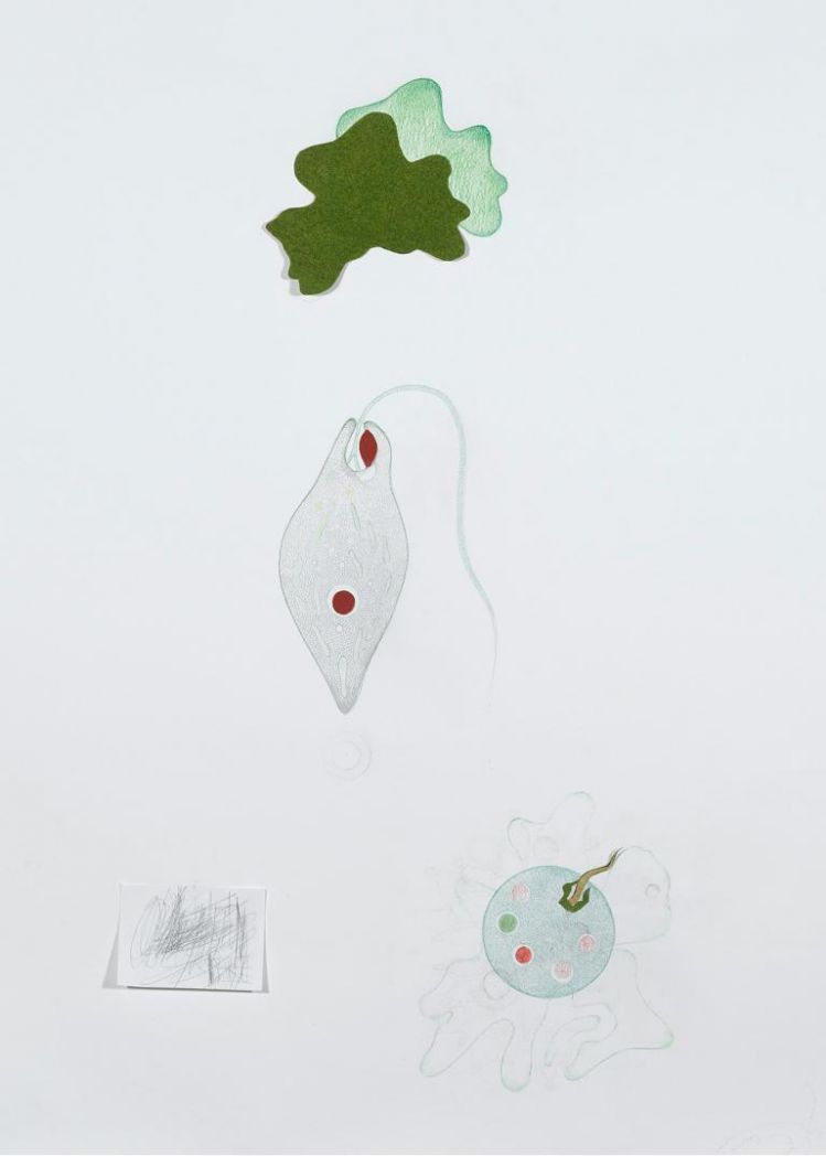 Martina Tscherni beschäftigt sich in ihren detailreichen großformatigen Zeichnungen, die eigentlich Mischtechniken aus Grafit-und Farbstiftzeichnung mit collagierten Einsprengsel sind, mit Form; mit Formen, die in einem mehr oder weniger bewussten Zustand auf dem Papier Gestalt annehmen.